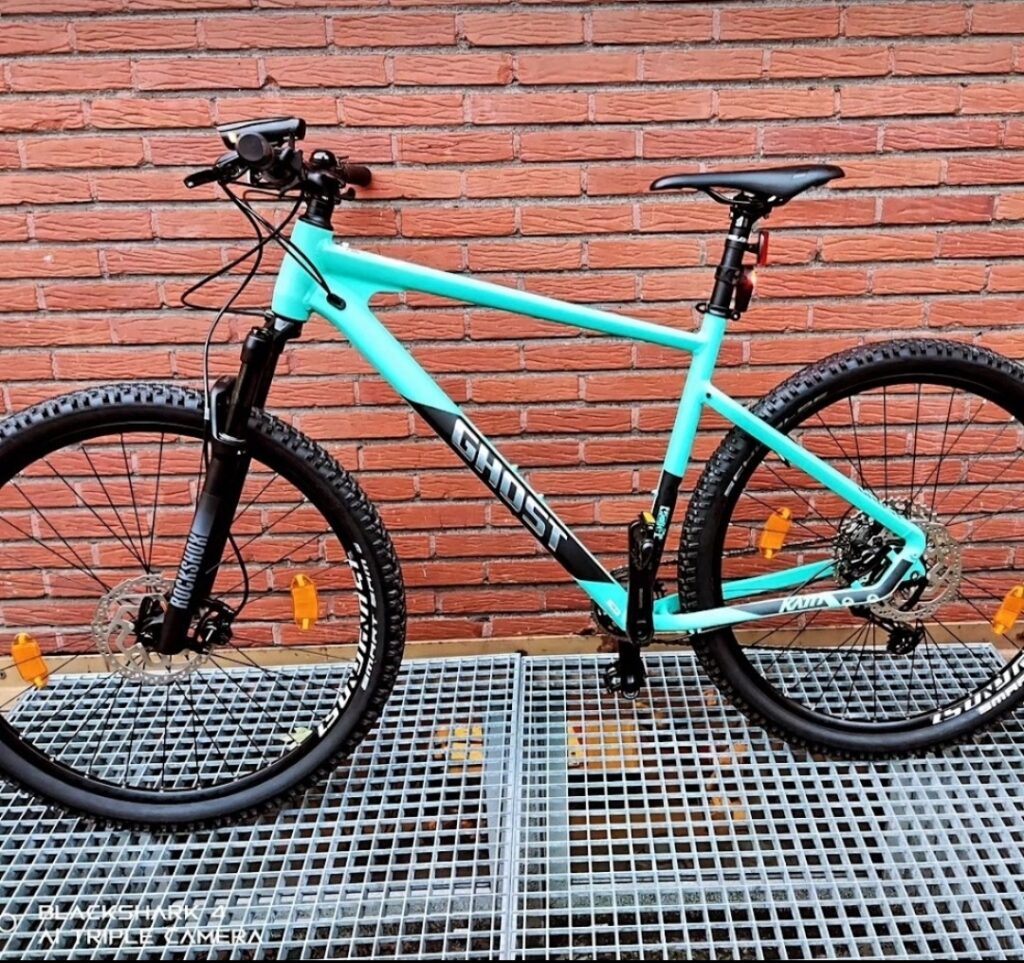 Bei dem Fahrrad handelt es sich um ein Ghost Kato Pro 29″ in einer grün-blau-türkisähnlichen Farbe (Cyan-Ton).